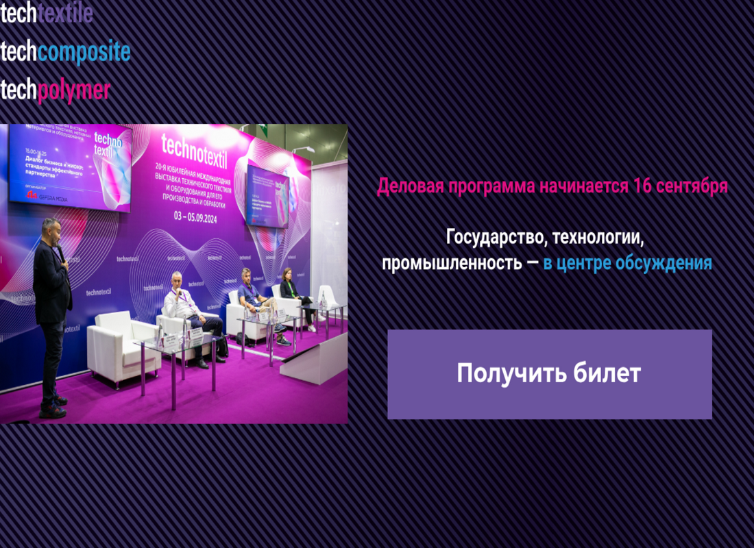 В первый день выставки Techtextile | Techcomposite | Techpolymer 2025 начнётся деловая программа. 16 сентября участники обсудят ключевые вопросы технологического развития, импортозамещения и экспортного потенциала российских материалов.